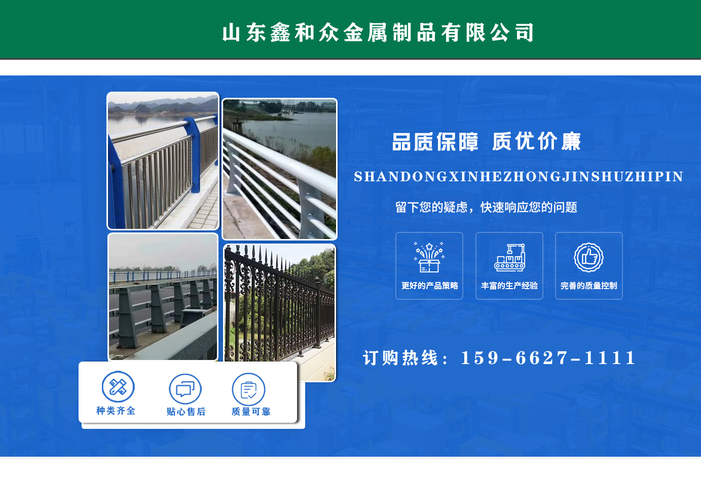 山東鑫和眾金屬制品有限公司主要產(chǎn)品有防撞護(hù)欄,橋梁護(hù)欄,道路護(hù)欄,河道護(hù)欄,不銹鋼護(hù)欄等護(hù)欄。提供設(shè)計(jì)方案,一站式定制,包您滿意價(jià)格優(yōu)惠,歡迎來(lái)電咨詢!    公司常年從事銷售護(hù)欄防撞護(hù)欄,橋梁護(hù)欄,道路護(hù)欄,河道護(hù)欄,不銹鋼護(hù)欄,橋梁鋼護(hù)欄,河道燈光護(hù)欄等。產(chǎn)品廣泛應(yīng)用于橋梁、河道、旅游景區(qū)、道路、公路、公園、小區(qū)、景觀、道路防撞等領(lǐng)域。    公司產(chǎn)品均采用優(yōu)質(zhì)不銹鋼材料,符合相關(guān)標(biāo)準(zhǔn)。各種型號(hào)不銹鋼復(fù)合管及護(hù)欄,質(zhì)量嚴(yán)格把控。產(chǎn)品強(qiáng)度高、耐腐蝕、焊接牢固、抗沖擊、性能好,防撞護(hù)欄結(jié)構(gòu)簡(jiǎn)單、美觀實(shí)用大方。     歡迎前來(lái)訂購(gòu)!...